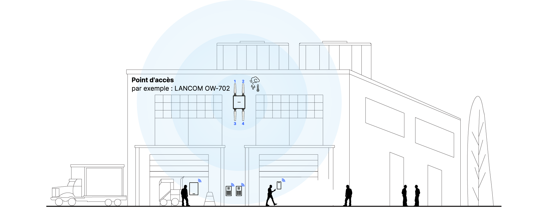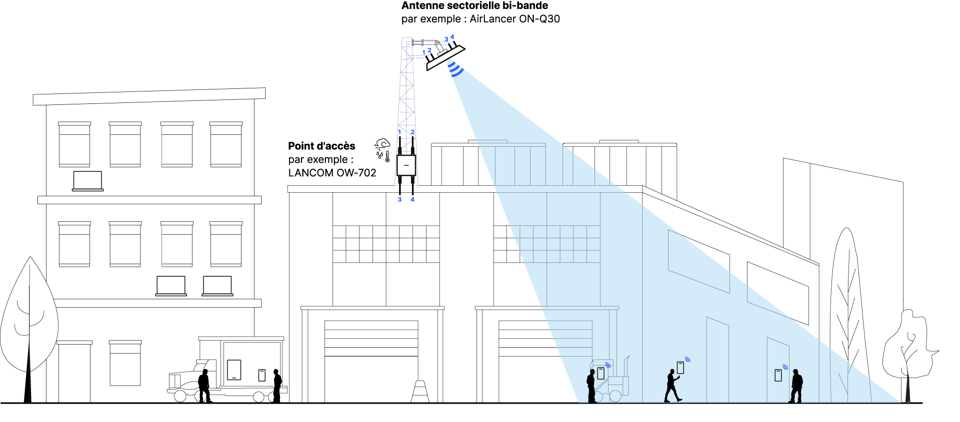 Dans les grands espaces extérieurs tels que les zones logistiques, les dépôts ou les sites industriels, la priorité est souvent donnée à la couverture ciblée de certaines zones, par exemple les zones de chargement, les voies de circulation ou les zones de stockage. Dans de tels scénarios, le LANCOM OW-702 peut être utilisé avec des antennes sectorielles disponibles en option afin d’orienter le signal Wi-Fi de manière ciblée dans une direction définie. Grâce à cette diffusion directionnelle, la puissance d'émission disponible est concentrée sur la zone concernée, ce qui permet d'atteindre des portées plus importantes le long des zones de travail et de circulation. Dans le même temps, le rayonnement radio est réduit dans les zones moins pertinentes. Il en résulte une infrastructure Wi-Fi stable pour les scanners mobiles, les véhicules, les machines ou les appareils IoT industriels, même sur des surfaces extérieures étendues et structurées.
