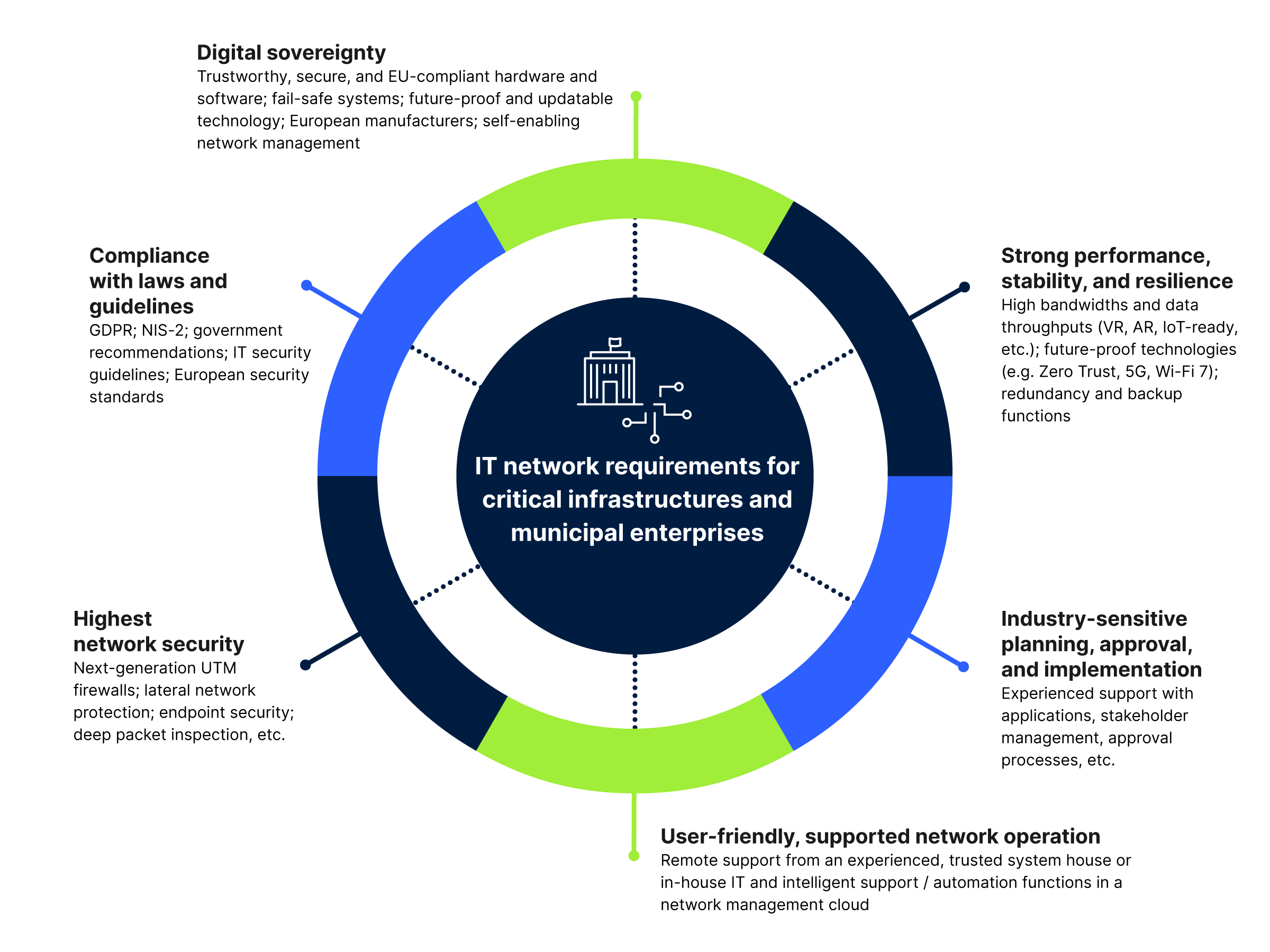 Qu’il s’agisse de l’approvisionnement en énergie, de la gestion de l’eau, des transports ou des services municipaux : les opérateurs d’infrastructures critiques portent une responsabilité majeure pour garantir la continuité des services et la stabilité de la société. D’où l’importance d’une infrastructure réseau informatique hautement disponible, sécurisée et pérenne, capable de se défendre contre les cyberattaques tout en permettant des processus numériques efficaces.